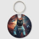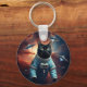 Uma imagem cativante de um gato negro vestido de astronauta, olhando com confiança para o cosmos. Cercado por discos voadores e nebulosa vibrante, o gato incorpora um senso de aventura e mistério.