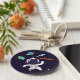 Um chaveiro personalizado com um fundo azul escuro com estrelas amarelas espalhadas ao redor. Camadas sobre o topo é uma ilustração de um espaçador vestindo um traje astronauta branco flutuando no espaço. À distância estão planetas com anéis e um foguete a explodir em lugares desconhecidos.