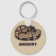 Este chaveiro apresenta um estilo realista de ilustração de um cobra de píton de bola enrolada em marrom escuro e bronzeado. Está pronto para ser personalizado com um nome em letras castanhas escuras. Faz um presente de excelente para donos de cobras de estimação.