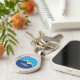 Chaveiro com um design com a bandeira de Orem, Utah. Uma bandeira azul, branca e amarela com picos de montanha e o sol no centro