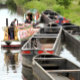 Um design fotográfico de barcos estreitos tentando andar no canal.