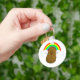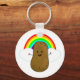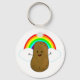 Batata de desenho animado fofo com um grande sorriso feliz no rosto. Atrás dele há um arco-íris listrado multicolorido brilhante com nuvens brancas fofas em ambas as extremidades.