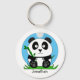 Urso panda branco e preto, segurando um tiro verde de bambu. Ele está sentado sobre uma grama verde com fundo azul. Abaixo do panda está um modelo em letras negras para adicionar seu nome para personalizar esta ilustração.
