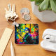 Uma mulher em frente a um fundo vibrante e colorido