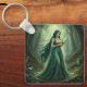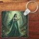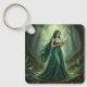 Uma bela fada vestindo um vestido verde fluente e um colar feito de esmeraldas com pétalas lírios do vale em seu longo cabelo verde esmeralda e asas verdes iridescentes de libélula verde-clara segurando um lírio do vale numa floresta mágica cercada de flores azuis e amarelas, lírios do vale e árvores cobertas de musgo.