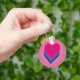 Basic Button Keychain with hearts design in colors of bisexuality; pink, purple and blue stripes pride flag, rainbow love design, on pink background
