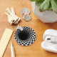 A tunnel-like optical illusion is created using a black and white checkered pattern, giving a dizzying sense of depth