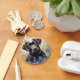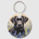 Um Labrador Retriever preto se senta num campo de vibrantes mosquiteiros, seu pelo escuro contrasta lindamente com as flores azuis brilhantes. Os olhos do cão estão focados no espectador, transmitindo um senso de calma e atento. O fundo apresenta um céu macio e nebuloso com matizes cor de laranja e amarelos quentes, sugerindo um pôr do sol pacífico. Presente ideal para amantes de labrador.