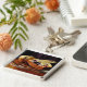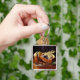 Este chaveiro apresenta muffins de mirtilo, regados pela boca, dispostos em uma placa de vidro brilhante em uma mesa de madeira. O fundo está mergulhado em um profundo tecido roxo.