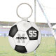 Este simples chaveiro de futebol esportivo para rapazes ou raparigas apresenta a imagem realista de uma bola de futebol tradicional com painéis em preto e branco - personalize com o nome do jogador, o monograma e o número de camisa - por katz_d_zynes