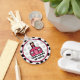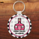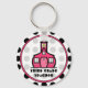 Um chaveiro com fundo bolinhas preto-e-branco. Logotipo de dentro da escola cor-de-rosa quente. Texto personalizável lê "Professor de terceiro grau"