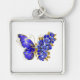 Borboleta de flores cinza, azul, safira, espumante com asa decorada com flores preciosos azuis com folhas de ouro sobre fundo branco.