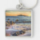 Série Cenas Inglesas Uma bela fotografia de paisagem do mar mostrando Burgh Island, tirada de Bantham Beach ao sol. A luz solar amarela do ouro profundo reflete sobre as rochas molhadas e os topos de ondas, infundindo toda a cena com calor. código de imagem: hrcol153