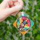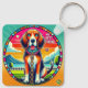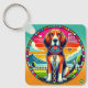 Ilustração admirável ao estilo cartoon de um cão com olhos brilhantes, vestindo uma coleira e uma corrente, colocada contra um fundo circular colorido.