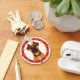 Ilustração adorável em estilo de desenho animado de um cão com olhos brilhantes, usando coleira e corrente, colocada contra um fundo circular colorido.