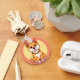 Ilustração encantadora de um cachorro de desenho animado fofo, sentado em um fundo circular vibrante. Perfeito para ilustrações infantis, temas de animais de estimação e designs alegres.