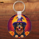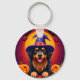 Cachorro retratado usando um chapéu de bruxa e gravata borboleta xadrez, adornado com abóboras, flores e morcegos. Perfeito para cartões de felicitações temáticos de Halloween, designs festivos e decorações sazonais.