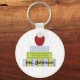 A cadeia-chave do professor de excelente, com trabalho de arte gráfico de uma pilha de livros coloridos, com uma maçã no topo, contra um fundo de bolinhas azul e branco. Personalize o texto preto com o nome do seu professor. Um presente perfeito para aquele professor especial.