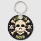 Um crânio e bósforos constituem esta engraçada cadeia-chave. Personalizável para que você possa adicionar seu próprio texto e alterar a cor de fundo. Excelente para encher essas meias!