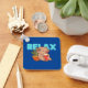Esta adorável chaveiro apresenta uma caricatura, capybara, sentada num pote laranja ao lado de uma planta verde. A capybara está segurando um livro vermelho e aparece contente, com a palavra "RELAX" por cima, em negrito, em letras azuis claras. Esta chaveiro é perfeita para amantes de capybara e para aqueles que desfrutam de uma vibração relaxada e pária. Feito de materiais de alta qualidade, é um acessório delicioso e durável para suas chaves, saco ou mochila.