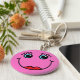 Esta cara rosa tem olhos azuis e lábios vermelhos.