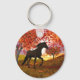 Um chaveiro com o meu trabalho de arte digital de um cavalo marrom e árvores de mapeamento com folhas laranja vibrantes.