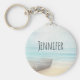 Uma corrente chave com uma bela imagem rústica. Cores sutis de azul claro, marrom arenoso e branco suave. Uma cena de praia com um barco na praia com uma rede de pesca pendurada ao lado. Um olhar elegante.
