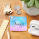 Chaveiro personalizado com fundo caprichoso. Um esquema de cores cor rosa e azul pastel. Pequenas estrelas brancas espalhadas ao redor. Design Whimsical e mágico.