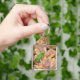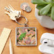 Chaveiro mostra a foto de um pequeno camaleão aninhado entre algumas plantas tropicais.