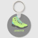 Este chaveiro apresenta uma ilustração de uma bota de caminhada em verde limão e aqua azul definida em relação a um fundo de cinza e está pronto para ser personalizado com um nome abaixo em letras verdes correspondentes.