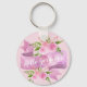 Chaveiro cor-de-rosa branca e bonito, com as palavras "Hello Gorgeous" num guião branco elegante, com um fundo de faixa de faixa púrpura lilás. Dois belos arranjos florais de primavera com rosas cor-de-rosa e verde completam o design. Esta chaveiro feminina e caprichosa faria um aniversário perfeito ou um presente de Natal!