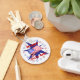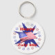 Chaveiro com meu design vermelho, branco e azul da bandeira americana cercado por estrelas. O texto diz "Feliz 4 de julho".