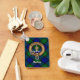 Crachá da crista Clan MacKay rodeado por uma correia e fivela sobre fundo tartano. Texto personalizado de ambos os lados.