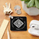 Chaveiro duplo com o seu código QR e texto personalizado num fundo de cor preto ou personalizado. Altere as cores das fontes, mova e redimensione os elementos com a ferramenta design.
