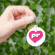 Este chaveiro apresenta um vibrante coração rosa-quente contendo letras maiúsculas em negrito, arredondadas, brancas e minúsculas pr, uma versão lúdica da abreviação para Porto Rico, a ilha encantada.