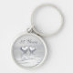 Chaveiro com meu design de dois corações prateados flutuando na água. O texto personalizável diz "25 anos".