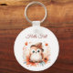 Uma coruja fofa vestindo um chapéu de outono decorado com bagas senta-se em um galho ao lado de uma flor de laranja e cercada por folhas de outono.
