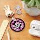 Crânio bonito e bósforos com arco pontilhado de polca cercado por corações e flores cor-de-rosa.