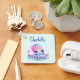 Um chaveiro com uma imagem de um polvo giro e giro com uma flor na cabeça. Grandes olhos brilhantes e um rosto amigável.