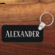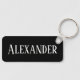 Cor simples de fundo preto sólido. A escolha da forma é um retângulo de canto arredondado, mas há outras opções. Você pode personalizar a cor e o estilo do texto personalizado de todos os bonés. Crie seu próprio chaveiro personalizado minimalista para seus veículos familiares.