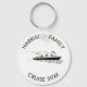 Uma ilustração de nave antiga em vermelho e preto simples parece que foi desenhada por uma criança. Um navio de transporte marítimo ou cruzeiro está navegando pela sua feliz através do oceano. O texto preto curvo no topo e no fim lê 'família de nomes personalizada' no topo e 'cruzeiro com ano personalizado' no final. Chaveiro de temas náuticos divertidos e personalizados para muitas ocasiões especiais, incluindo feriados familiares de cruzeiro, festas de aniversário náutico e muito mais. Comprar um para cada membro da família para um souvenir de férias de cruzeiro personalizado de reagrupamento familiar.