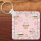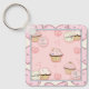 Corrente de teclas quadradas com uma bela imagem rosa e um motivo de fundo com cupcakes e texto caprichoso:"A vida é curta. Coma um cupcake!" Substitua o fundo por uma foto ou um gráfico de arte, se desejar.