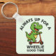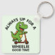 Featuring a cheerful little dinosaur riding a scooter, this keychain proudly declares, "Always up for a Wheelie good time." Whether you're gifting it to a kid, a scooter enthusiast, or a dino lover, it’s guaranteed to bring smiles.