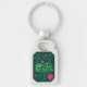 Design chaveiro original verde e cor-de-rosa que inclui a palavra "paz", um sinal de paz, espirais e flores. Chaveiro de metal com um brilhante design de paz verde-brilhante e formas de flores rosa-quente num fundo verde-escuro.