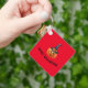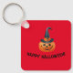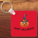 A frente da chaveiro mostra uma abóbora de ressonância sobre fundo vermelho, junto com as palavras "Feliz Dia das Bruxas!". O chaveiro pode ser facilmente personalizado.