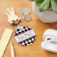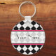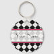 Um chaveiro com um fundo argyle preto com fundo rosa quente. Personalize com seu nome na seção central.