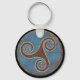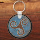 Um chaveiro com o clássico design de Triskele Celta sobre um belo fundo do escudo Viking de madeira.