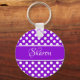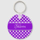 Chaveiro em um pequeno padrão de pontos brancos em fundo roxo. Personalize-o com seu próprio nome, monograma ou outro texto. Você também pode alterar fontes, ajustar tamanhos de fonte e cores de fonte ou mover o texto.