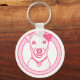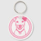 Um chaveiro com uma foto cor-de-rosa e branca de um Jack Russell Terrier a espreitar de uma estrutura em forma de círculo correspondente.