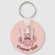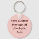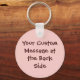 Cartoon de chef Lula rosa com bigode segurando faca e garfo de cozinha. Cor de fundo personalizada. Texto personalizado em ambos os lados.